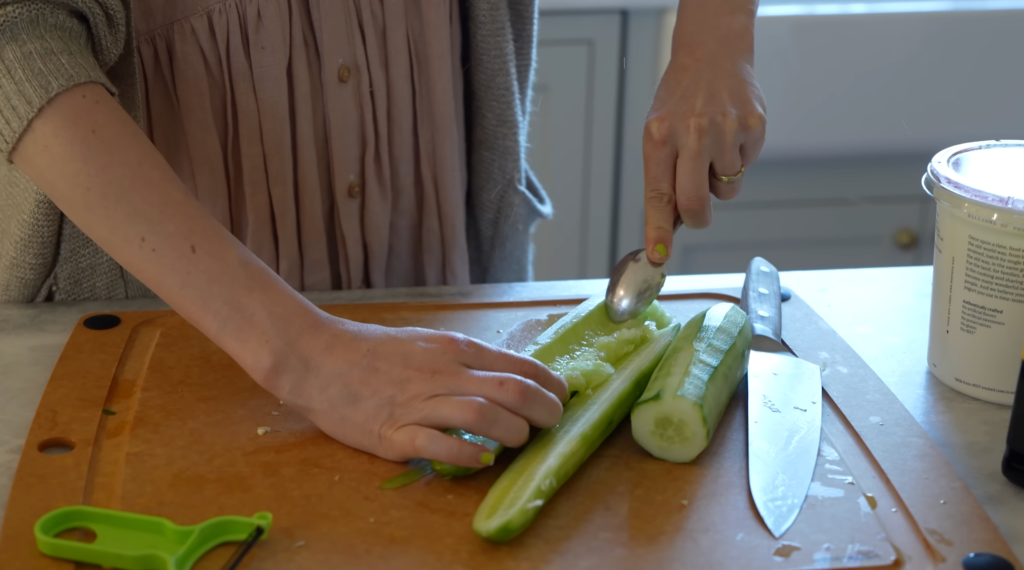 1. Slice the cucumber in half lengthwise and scoop out the watery, seedy center with a spoon