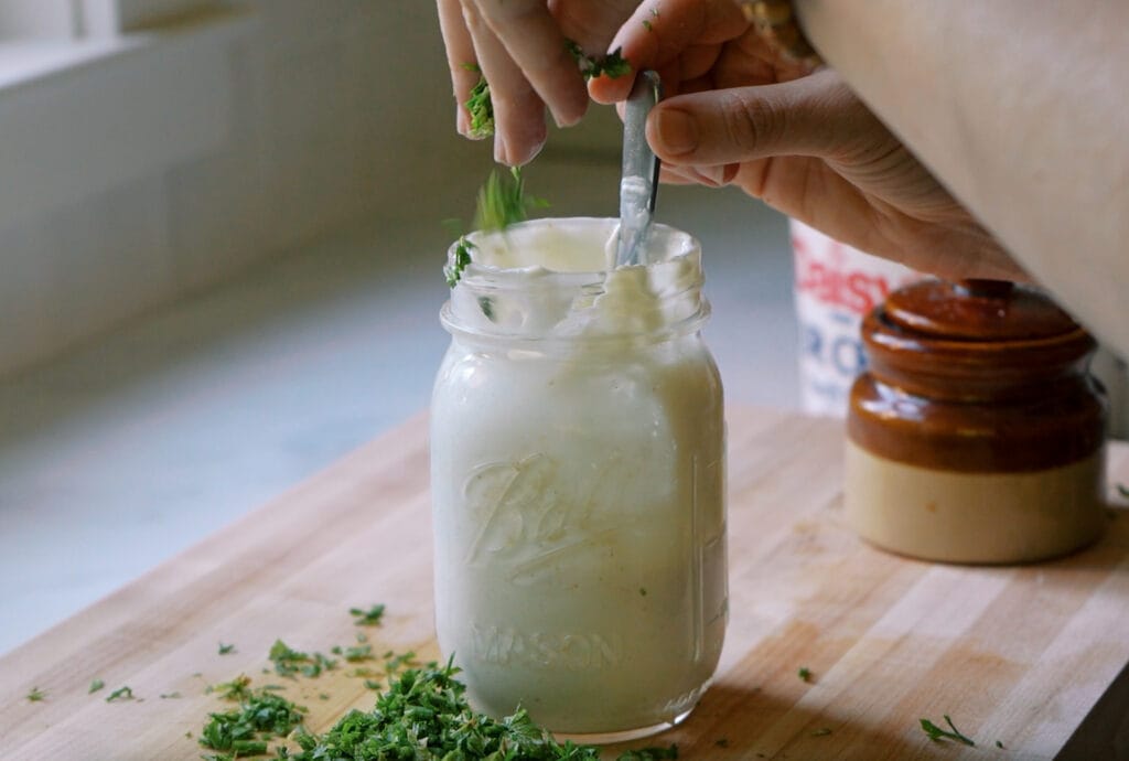 - In a bowl, whisk mayo, sour cream, and milk until smooth.