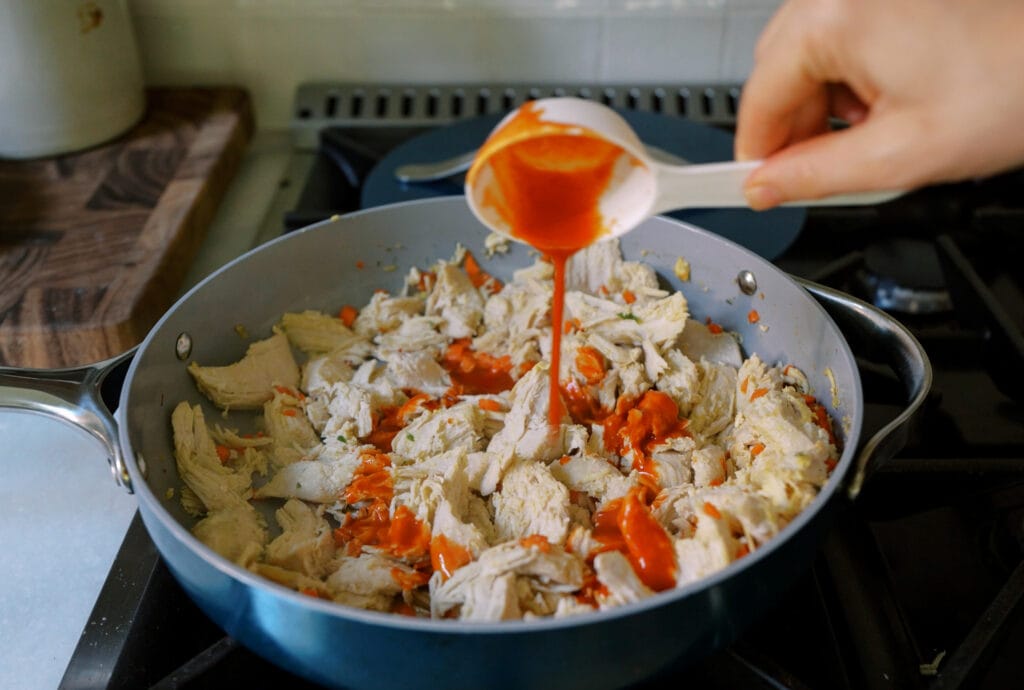 - Add shredded chicken, broth, hot sauce, and vinegar. Stir until heated through and coated in the spicy sauce. Adjust broth for saucier chicken if desired.