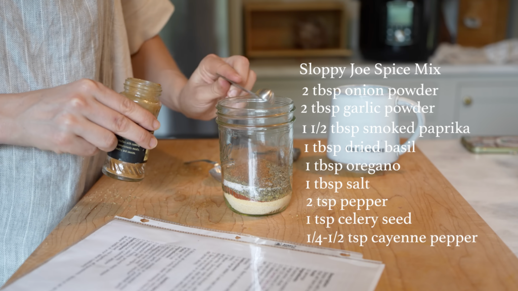 This recipe uses my go to homemade sloppy joe spice mix, which I like to keep mixed up in a jar ahead of time so freezer meal days move faster. You can find the full spice mix recipe here and use it for this batch or save it for future meals.