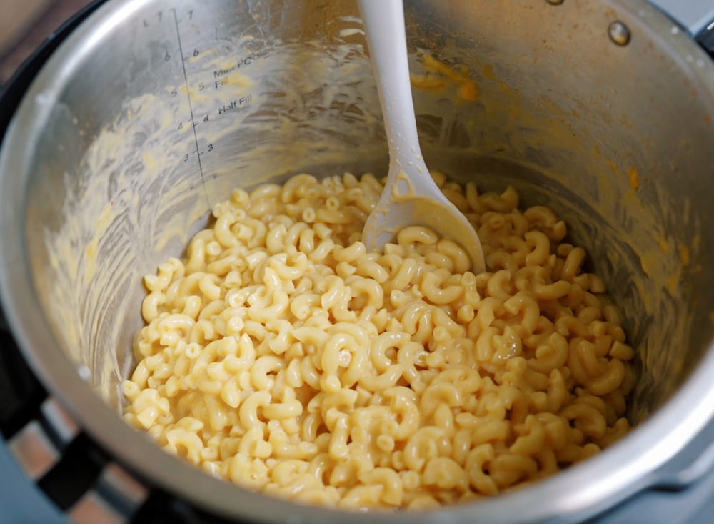 - Add the pasta, water, 1 tbsp butter, salt, onion powder, dry mustard, and hot sauce to the instant pot. Close the lid, seal, and cook on high pressure for 4 minutes.