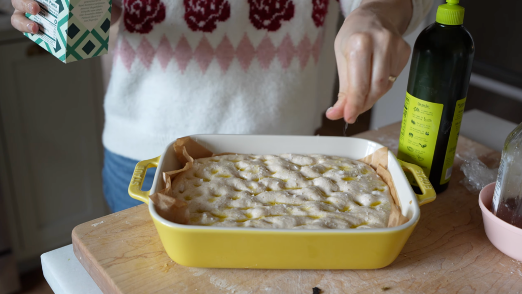 When the dough is ready, press dimples into the surface with oiled fingers, drizzle generously with olive oil, and sprinkle with salt. A flaky salt like Maldon Sea Salt works especially well here. Bake until golden, about 22-28 minutes.