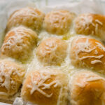 I chose to shape my dough balls into 20 sections because they do turn out pretty large and I wanted them to stretch further to feed a crowd. This makes filling those pans less uniform, but it can be done. Typically 9 dough balls per 8x8 square pan is a perfect fit, I just stuffed an extra one in there : ) A 9x9 pan would have worked better for me for the 20 rolls.